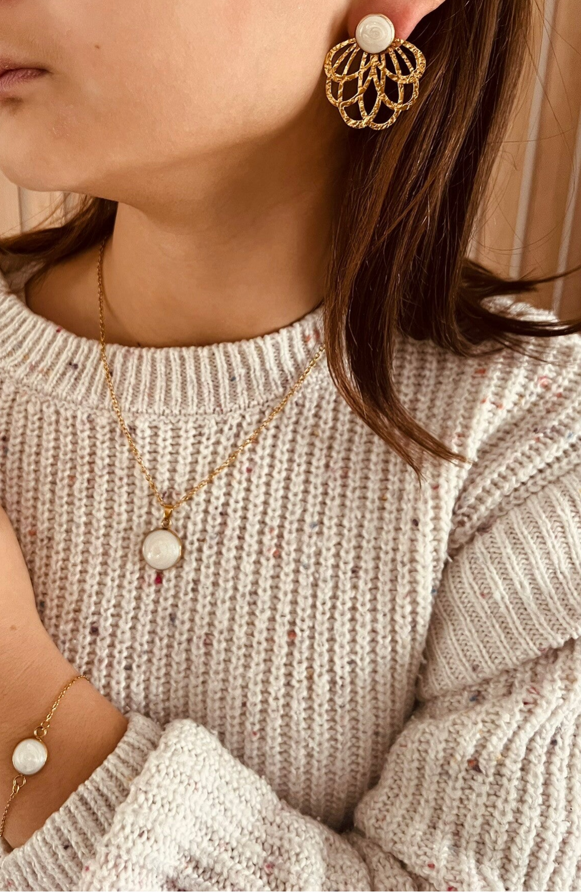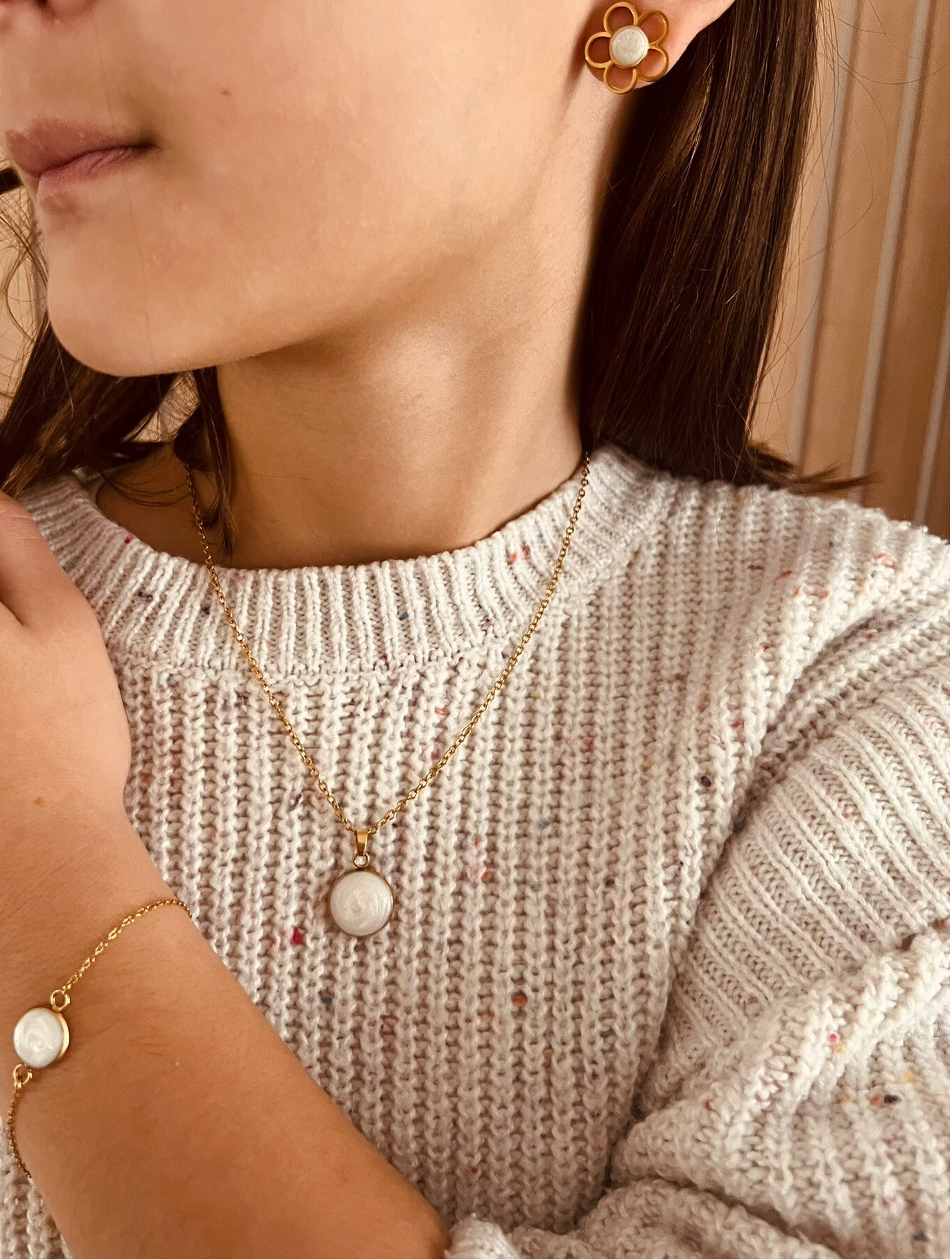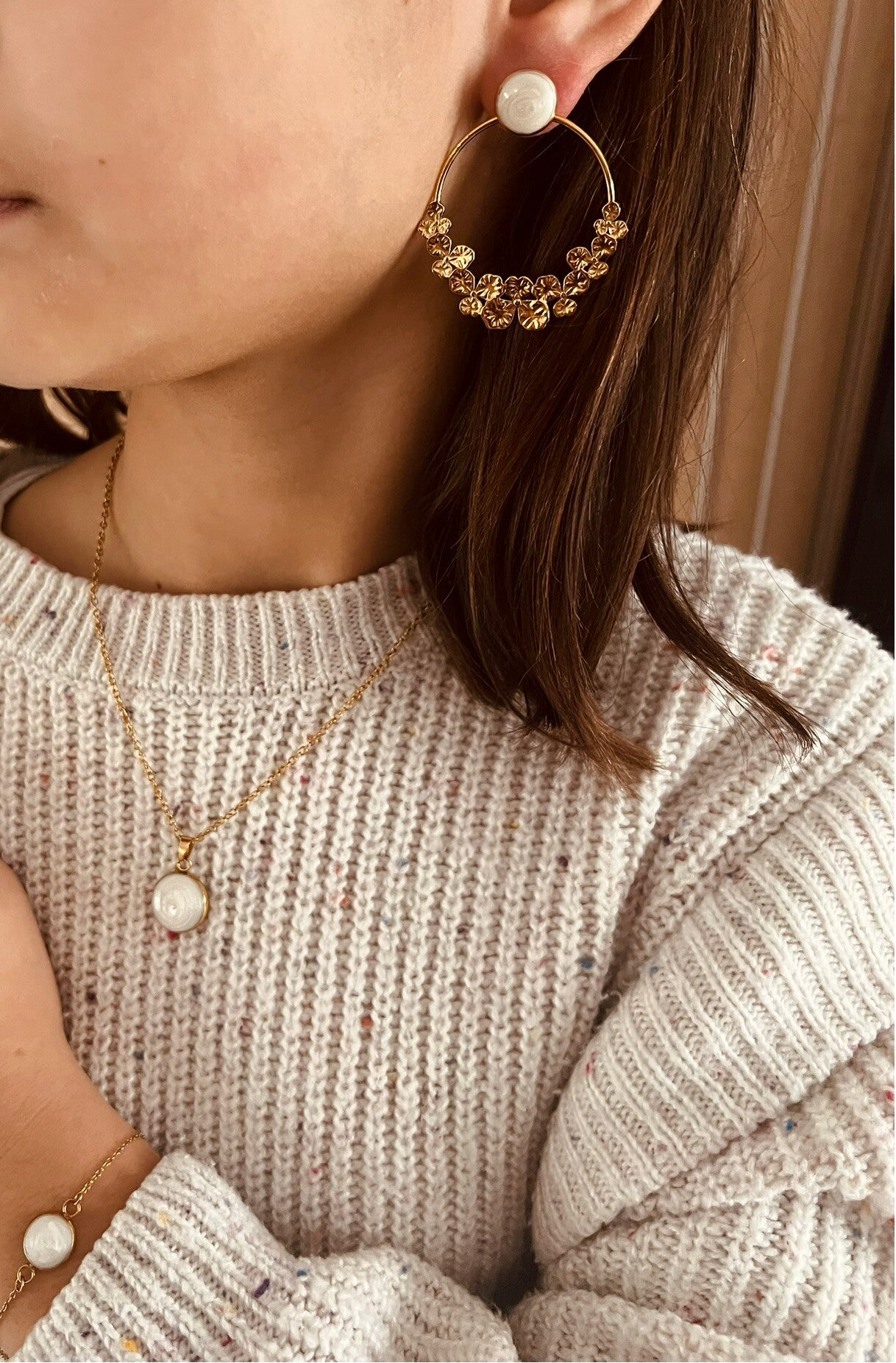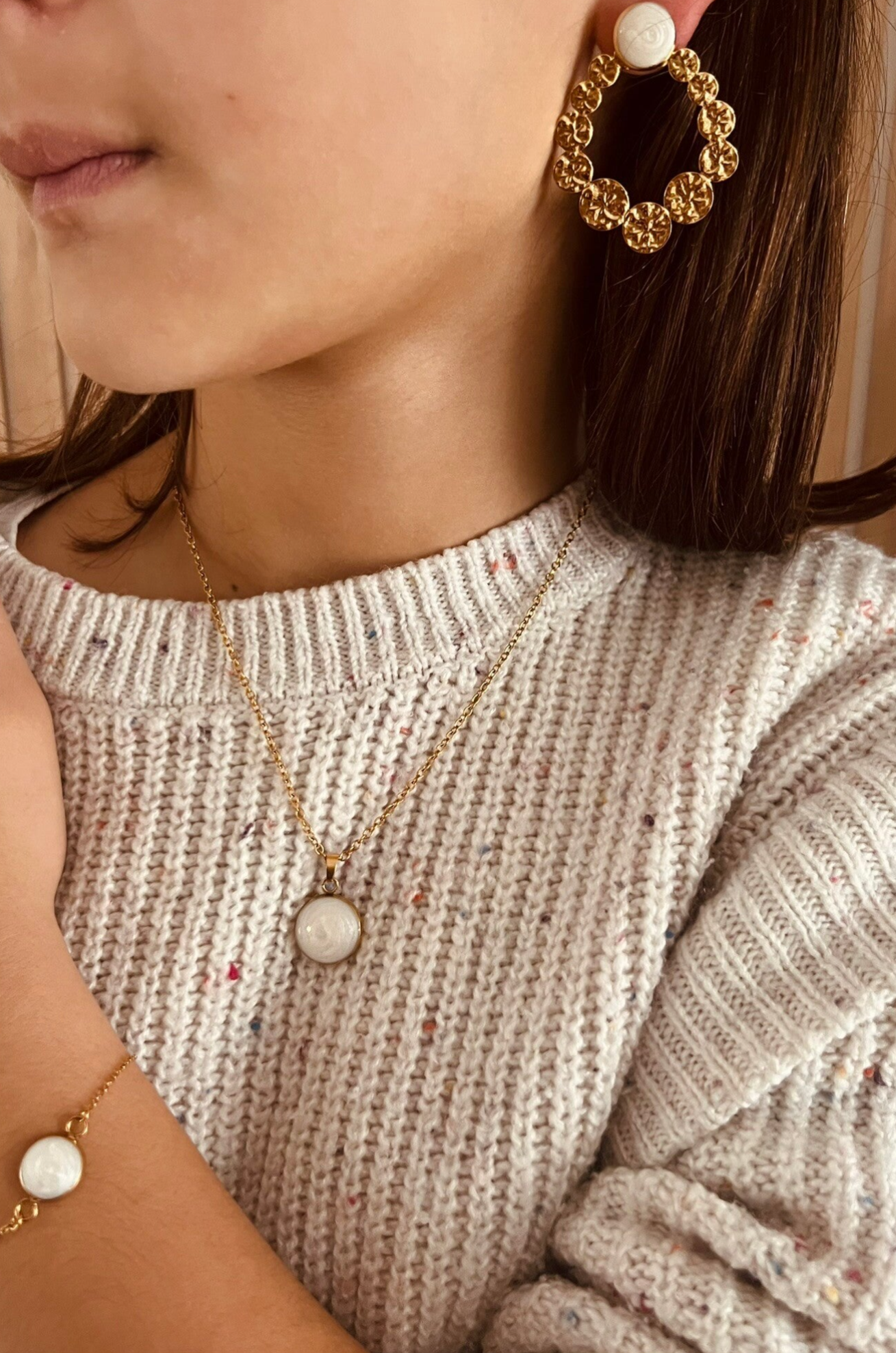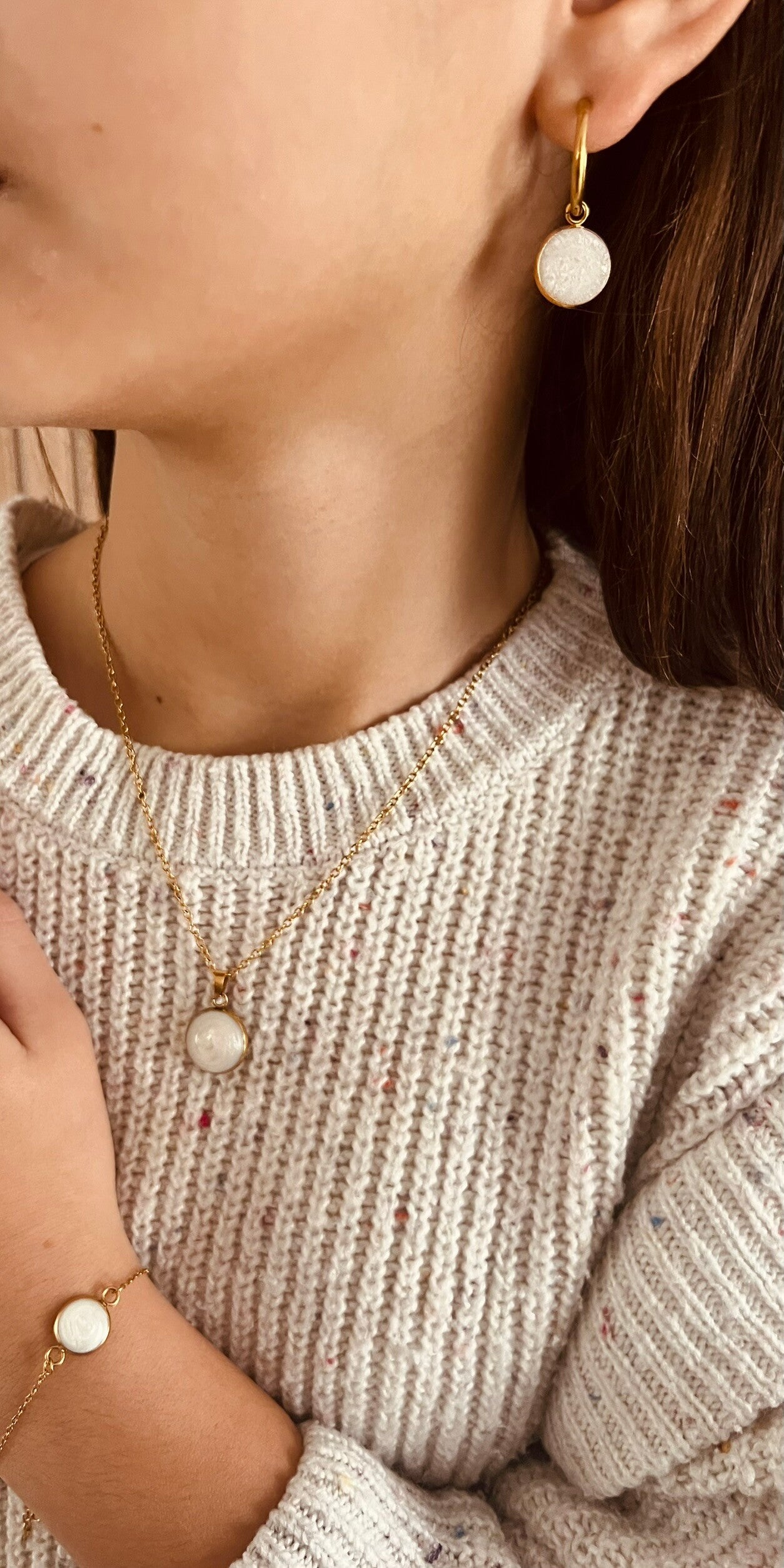 Ils sont spécialement conçus pour s’assortir à la jolie pampille Alma, aux grandes boucles d’oreilles à pastilles interchangeables ainsi qu’au collier, pour un total look harmonieux et élégant ✨